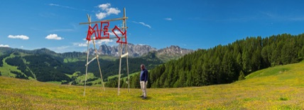 Die Skulpturen der Serie „landscape inscriptions“ beschriften die Landschaft mit leuchtend orangen Worten und Symbolen, deren Inhalt individuelle Kommentare und Gedanken wiedergibt.